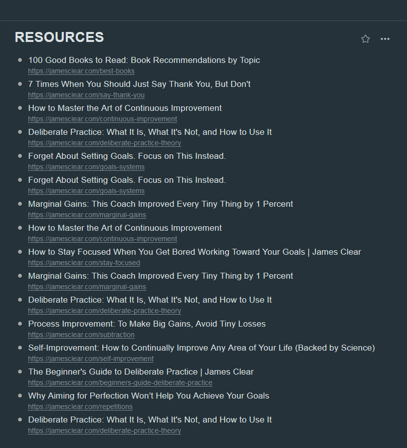 許多時候我在研究某個題材時(例:C++),收集資料的過程經常找到相同的資源,一旦認定有潛在參考價值,就用 WorkFlowy Clipper 收起來。隨著時間推演,有些重覆出現的資料又被收集到 WorkFlowy 裡。