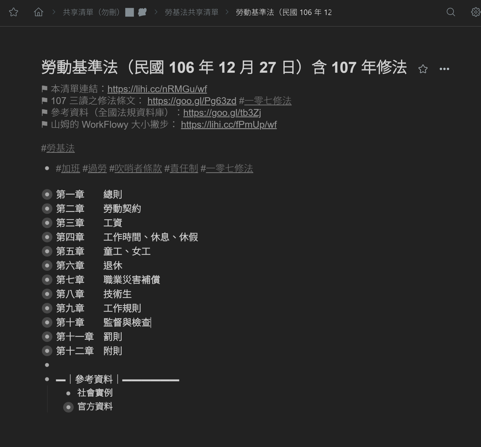 再來是共享清單,一個讓 WorkFlowy 突出的重要功能之一。我利用這個功能做了許多公開的共享清單1 2 3,這是我最愛的 WorkFlowy 功能!