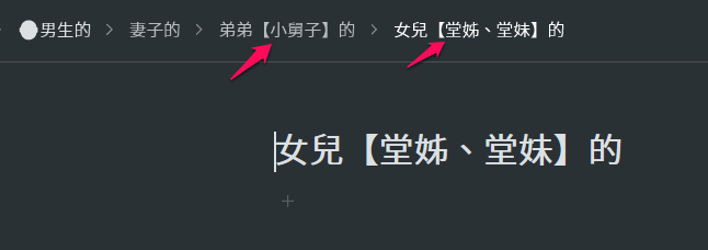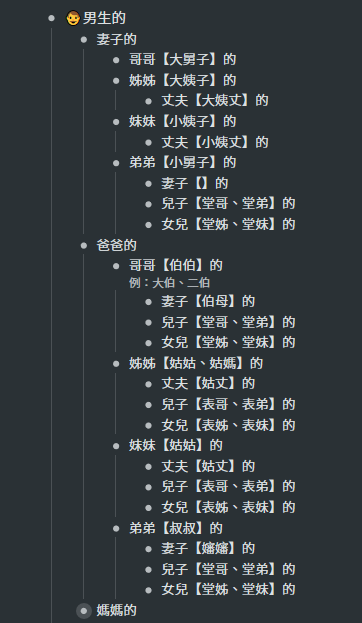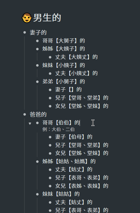 為解決這個問題,我利用 WorkFlowy 的樹狀結構,以自己為根,往下拉出長輩以及後輩的血親,然後用【】加上稱謂,如【舅媽】。目前還未完成,但架構已經確定,如下圖: